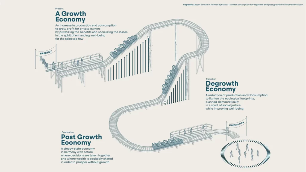 The transition from a growth society to a post-growth society will demand, alongside the creation of a new social imaginary, a complete transformation and redesign of the global, national, and local economies.