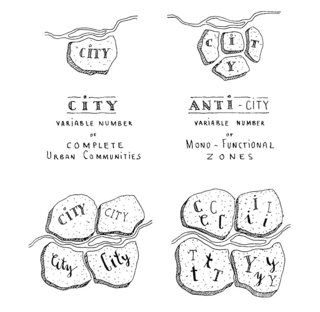 Anothet Leon Krier sketch, this one exemplifying the different ways to build communities and cities based solely on funtional zoning.