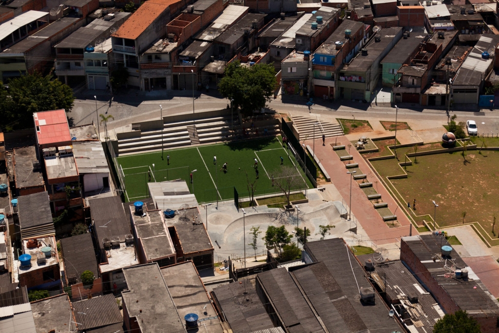 An aerial view of the urban intervention in the informal neighborhood called Cantinho do Céu, in São Paulo. The intervention consisted in providing infrastructural improvements while also to considering how to better integrate the complex into the urban systems.